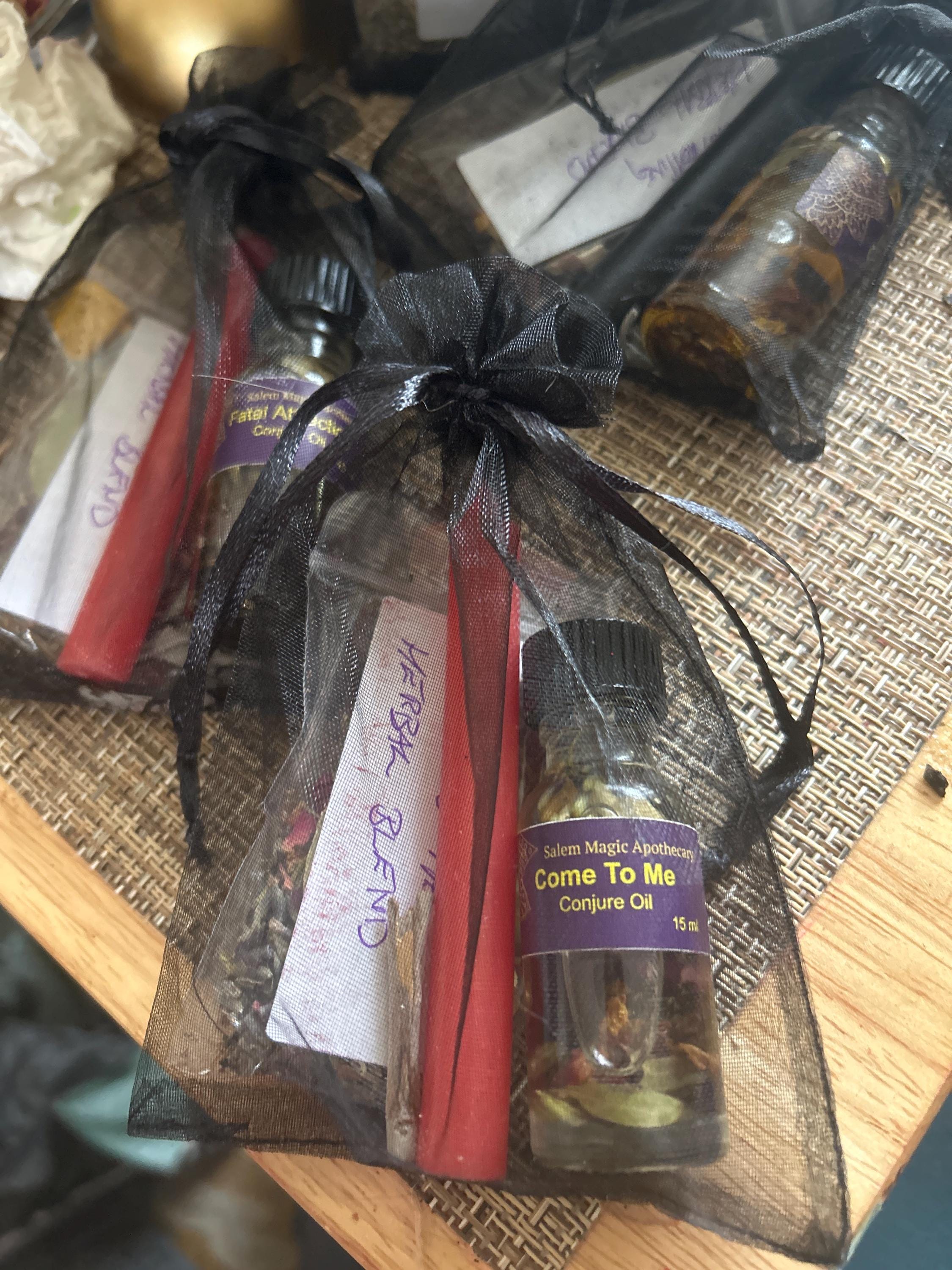 This listing is for one .50 oz bottle of COME TO ME Oil and a corresponding RED candle which comes lovingly packaged.